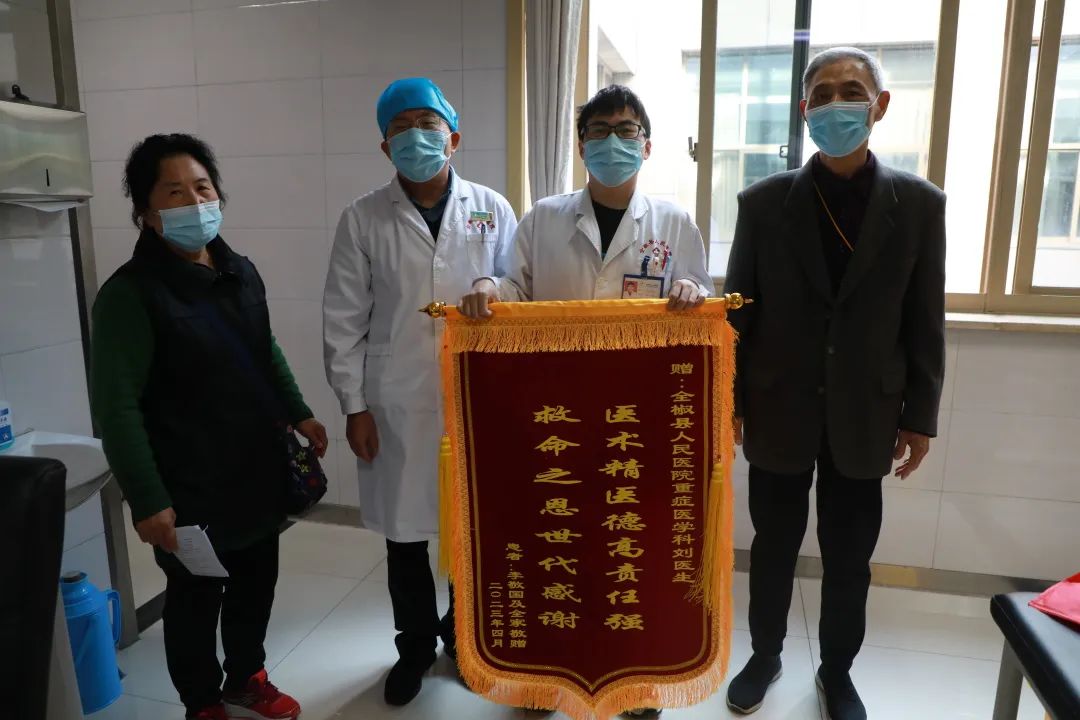 2023年5月9日早上,在呼吸与危重症学科里,正上演着温情一幕。家住南京市区的李大爷,不辞辛苦来到全椒,亲手将一面印有“医术精医德高责任强,救命之恩世代感谢”的锦旗送到该科室刘浩洋医生手里,感谢呼吸与危重症学科沈遵堂主任与刘浩洋医生积极救治,一路相护,让自己涅槃重生,并经过大半年康复锻炼,恢复良好。"千言万语道不尽我们心中的感激,你们挽救的不仅是一个生命,更是一个家庭!”在场医护人员不约而同露出欣慰的笑容......