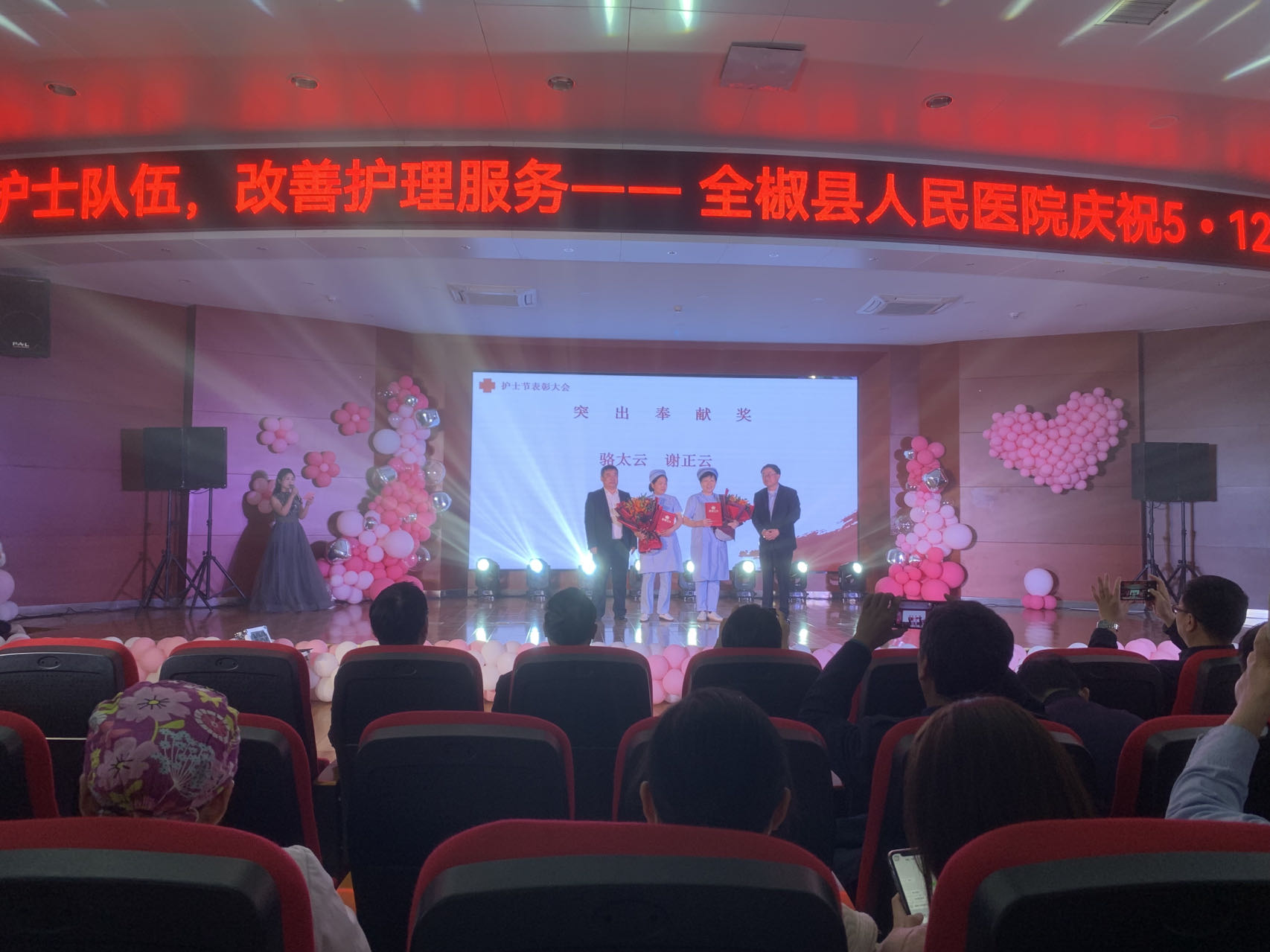 会议现场,表彰了“突出贡献者”、“急救护理技能操作竞赛”获奖者、“院感竞赛”获奖者及最美护士。