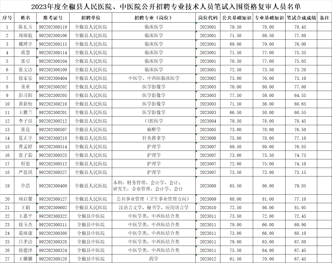 附件1:2023年度全椒县人民医院、中医院公开招聘专业技术人员笔试入围资格复审人员名单