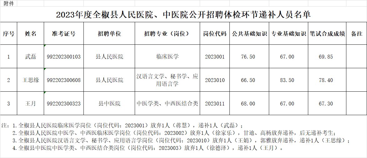在体检环节,有4名考生自愿放弃,依据《2023年度全椒县人民医院、中医院公开招聘专业技术人员公告》精神,按考试成绩从高分到低分依次等额递补。因设最低合格分数线,实际符合递补条件的人员3人。现将体检环节递补人员名单予以公示(详见附件)。