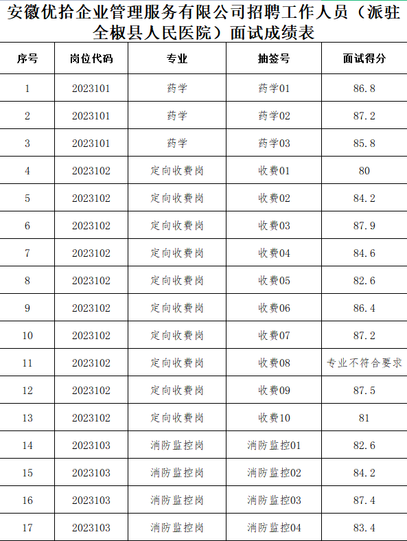 2023年安徽优拾企业管理服务有限公司招聘工作人员(派驻全椒县人民医院)面试成绩于2023年7月5日在全椒县人民医院网(www.qjxyy.com)公布。自2023年7月5日至7月10日公示6天。