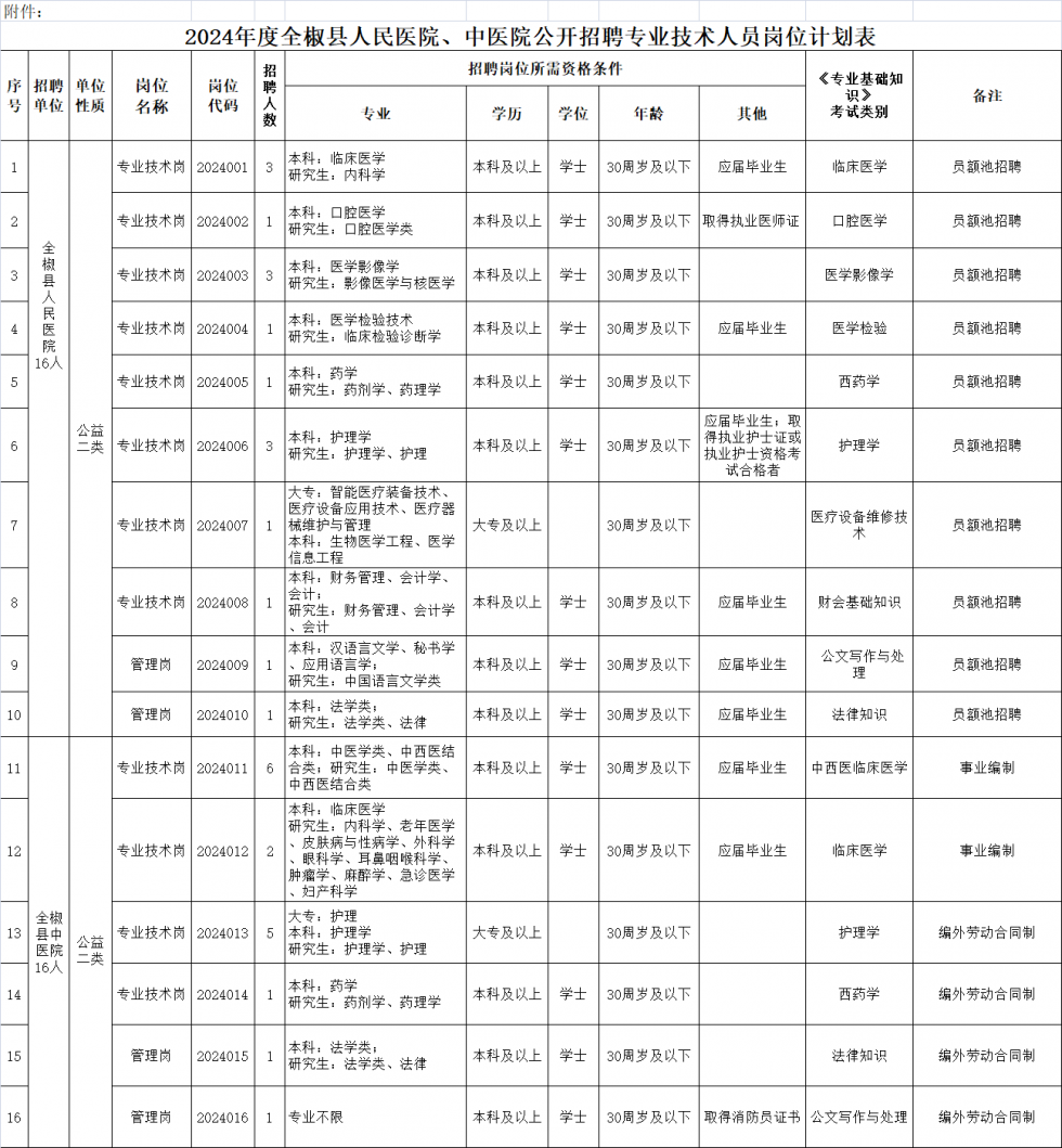 附:2024年度全椒县人民医院、中医院公开招聘专业技术人员岗位计划表