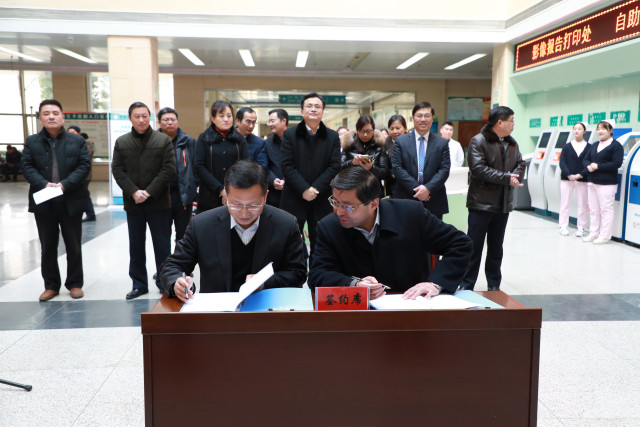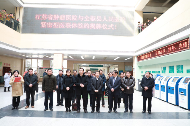 2月7日下午,江苏省肿瘤医院与全椒县人民医院紧密型医联体签约挂牌仪式在全椒县人民医院门诊大厅隆重举行!江苏省肿瘤医院院长冯继锋、副院长张勤、事业发展部主任吴建中、医务处处长王金华、肿瘤内科主任陆建伟、放疗科主任何侠、介入科主任尹国文、宣传处处长胥林花、财务处处长季花、放疗科郭文杰主任医师及江苏省肿瘤医院相关人员,全椒县委常委、县政府常务副县长史法勇、副县长尚云,县卫计委主任胡林,县卫计委副主任兼县医院党总支书记廖勇,县医院院长李飞等人出席签约挂牌仪式。县医院中层干部、医护人员等近100人参加了仪式。