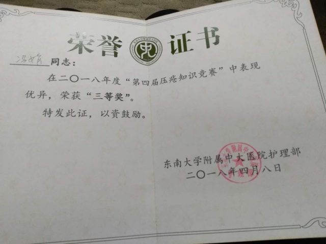 4月8号下午,全椒县人民医院神经内科护师冯娟同志在东南大学附属中大医院举行的第四届压疮知识竞赛中表现突出,一举拿下了个人三等奖。