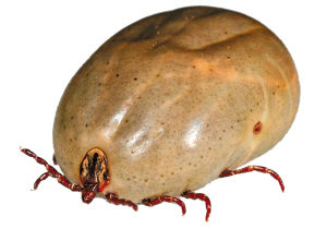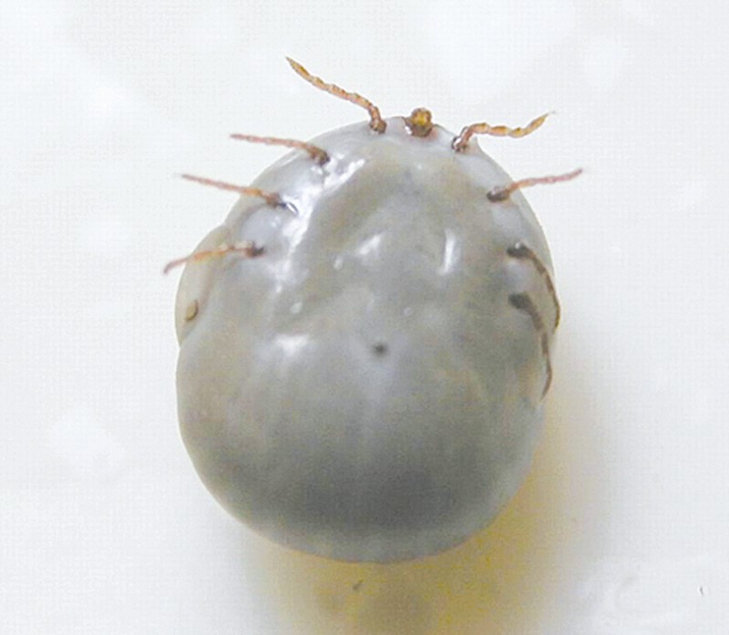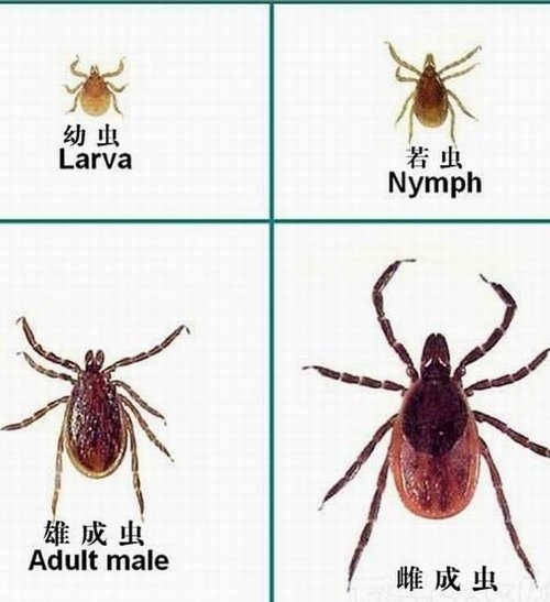 蜱 也叫壁虱,俗称草扒子、草别子。蛰伏在浅山丘陵的草丛、植物上,爱躲在茶叶背面。不吸血时,有米粒大小,吸饱血液后,有指甲盖大。蜱虫叮咬的无形体病属于传染病,人对此病普遍易感