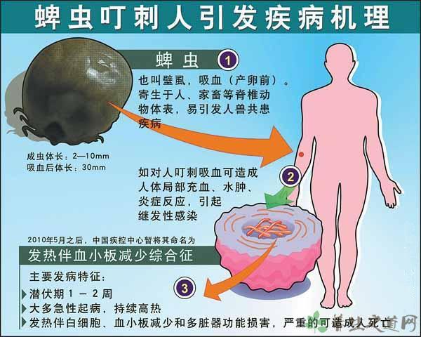 “蜱虫病”, 即发热伴血小板减少综合征,是中国疾病预防控制中心新近在我国中部地区发现的由布尼亚病毒引起的新发传染病,是一种自然疫原性疾病,蜱为其传播媒介。该病以发热伴血小板减少为主要表现,大多数患者有恶心、呕吐及食欲不振等消化道症状和乏力等表现,其中少数重症患者可因多脏器损害,救治无效死亡。