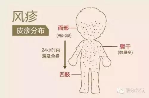 皮疹为浅红色或红色斑丘疹,一般由面部延及躯干和四肢,但手掌和足底常无疹,以及耳后、枕后及颈部淋巴结肿大。