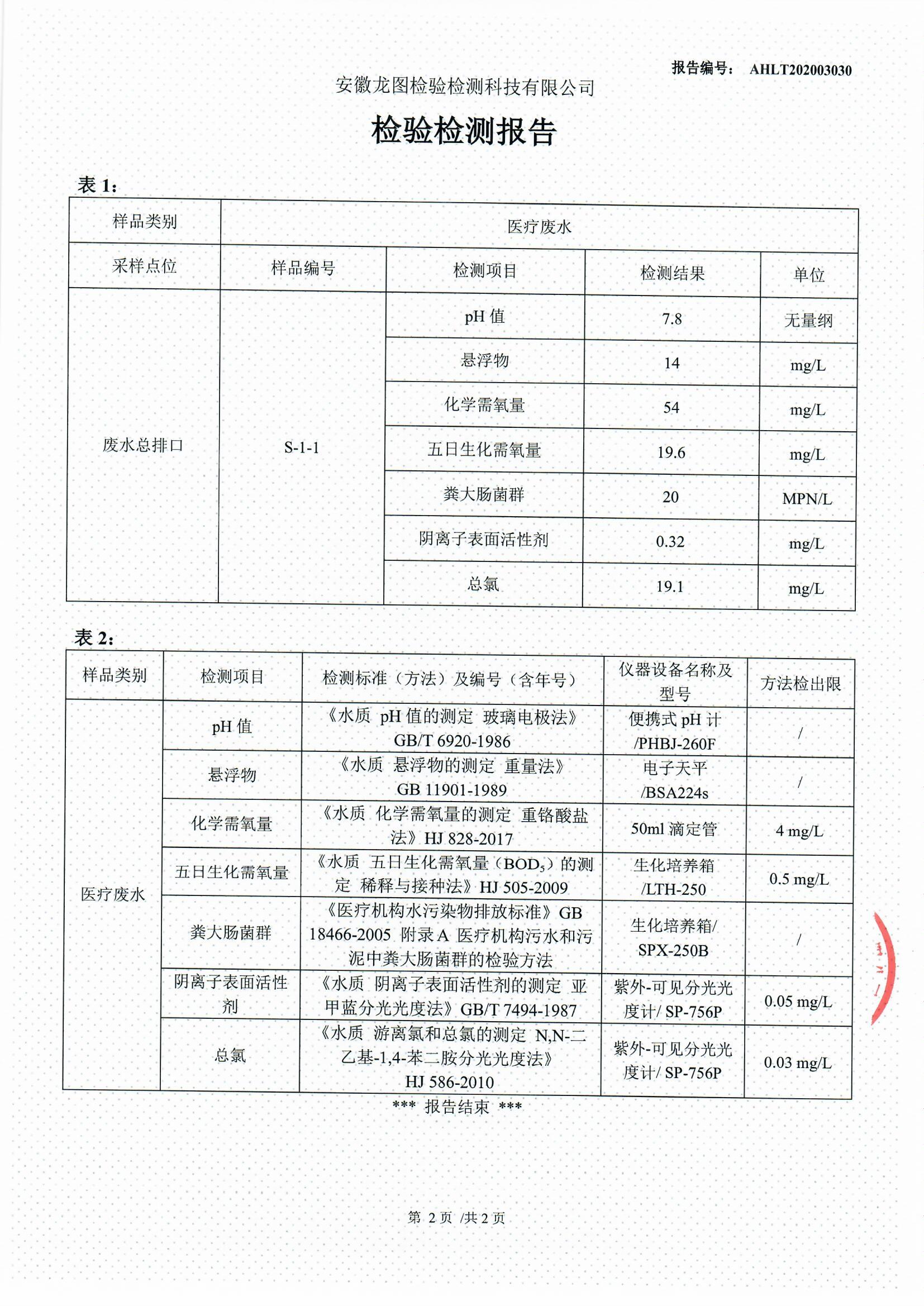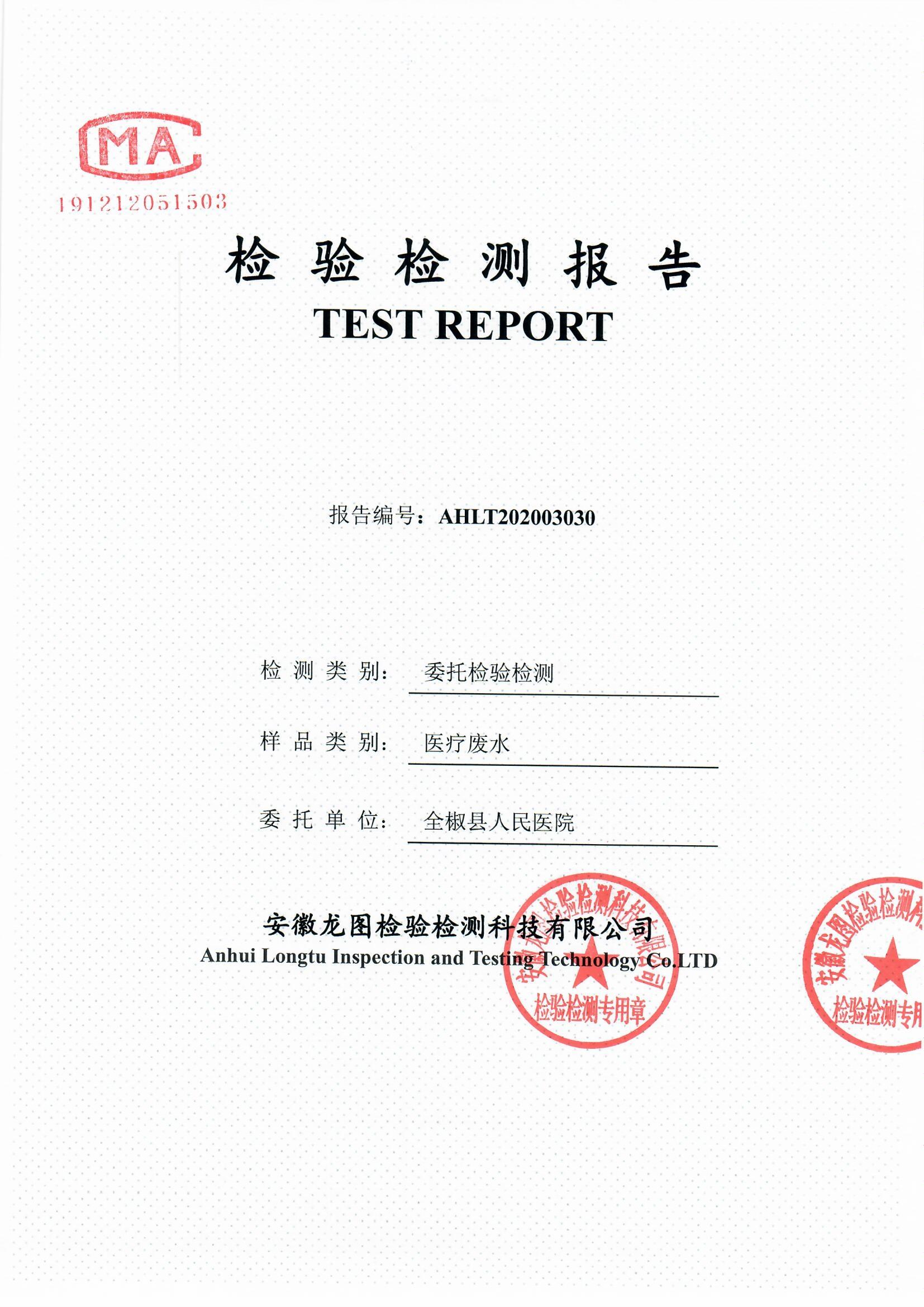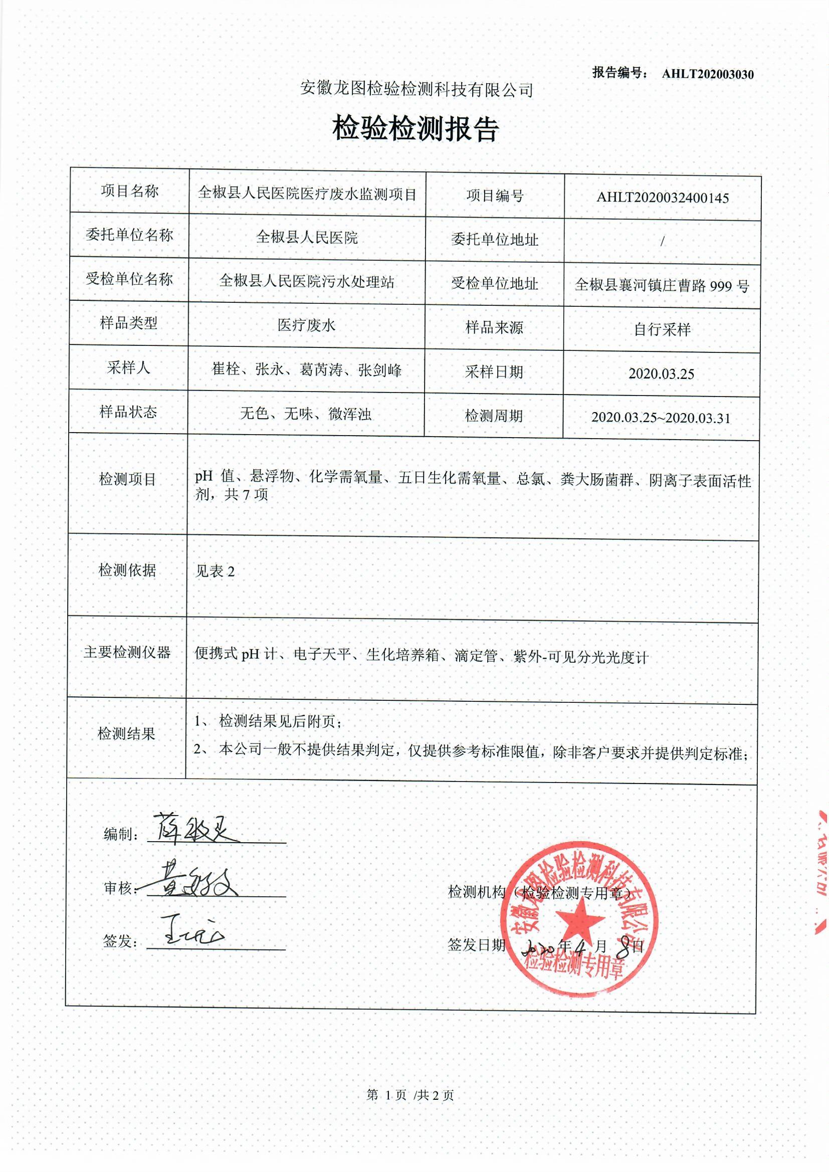 2020年4月全椒县人民医院医疗废水自行检测报告