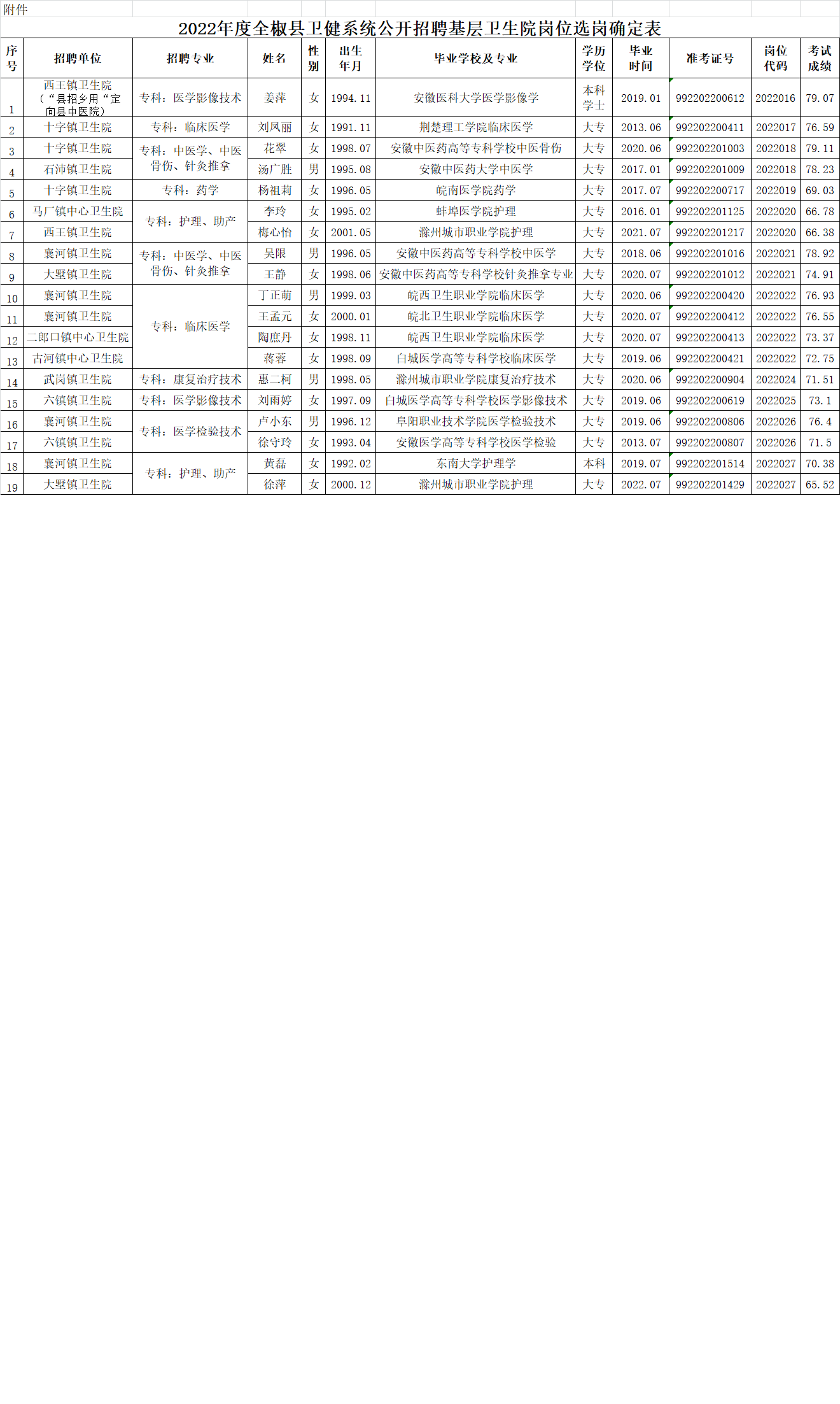附:2022年度全椒县卫健系统公开招聘基层卫生院岗位选岗确定表