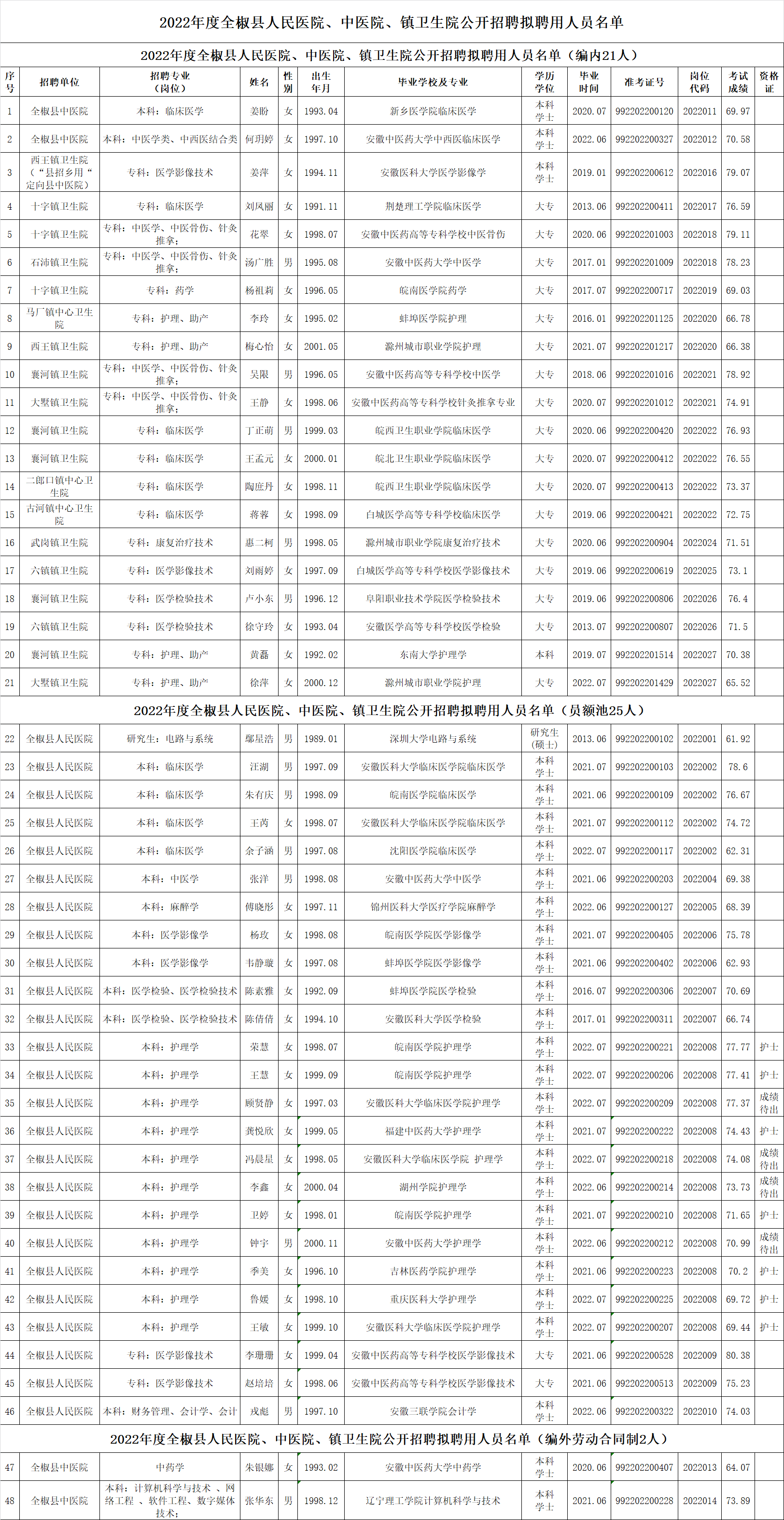 附件:2022年度全椒县人民医院、中医院、镇卫生院公开招聘拟聘用人员名单